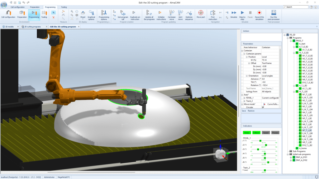 Valide os programas antes da produção: simule todo o processo de corte em um gêmeo digital da célula robótica para verificar a acessibilidade, as trajetórias e as operações de corte antes de enviar o programa para a oficina.